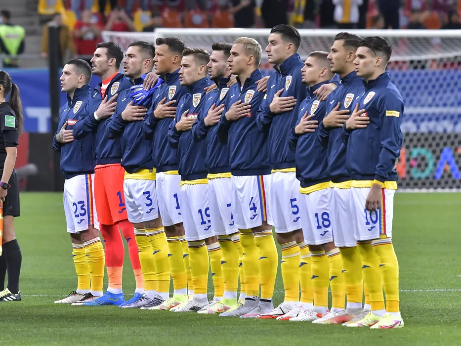 Fotbalistii romani la intonarea imnului national la meciul de fotbal dintre Romania si Liechtenstein, contand pentru Preliminariile CM 2022, desfasurat pe Arena Nationala din Bucuresti, duminica 5 septembrie 2021. © FOTO:Razvan Pasarica/SPORT PICTURES