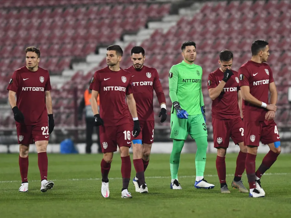 Fotbalistii clujeni Gabriel Debeljuh, Mateo Susic, Andrei Andonie Burca Cristian Balgradean, Alexandru Mihaita Chipciu si Cristian Marian Manea intra pe teren la meciul de fotbal dintre CFR Cluj si TSKA Sofia din cadrul grupei A a Ligii Europa, disputat fara spectatori pe stadionul Dr. Constantin Radulescu din Cluj-Napoca, joi 3 decembrie 2020. © FOTO:Flaviu Buboi / Sport Pictures