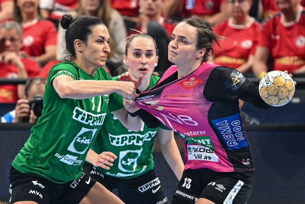 Andrea Lekic of FTC, left, vies for the ball with Anna Vyakhireva of Kristiansand during the women's handball Champions' League final match between FTC-Rail Cargo of Hungary and Vipers Kristiansand of Norway at the MVM Dome in Budapest, Hungary, Sunday, June 4, 2023.,Image: 781405980, License: Rights-managed, Restrictions: This content is intended for editorial use only. For other uses, additional clearances may be required.