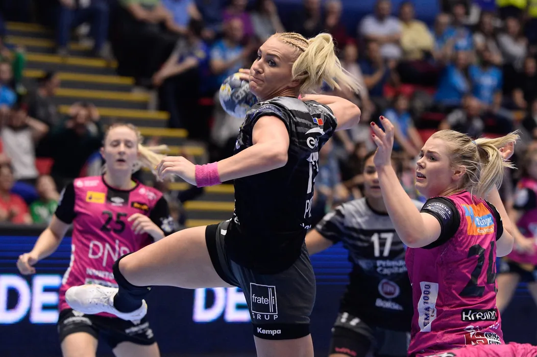Crina Pintea (S), de la CSM Bucuresti, lupta sa inscrie, in meciul de handbal feminin contra echipei Vipers Kristiansand , contand pentru Liga Campionilor, disputat la Sala Polivalenta din Bucuresti, sambata, 7 matie 2020. EDUARD VINATORU / MEDIAFAX FOTO