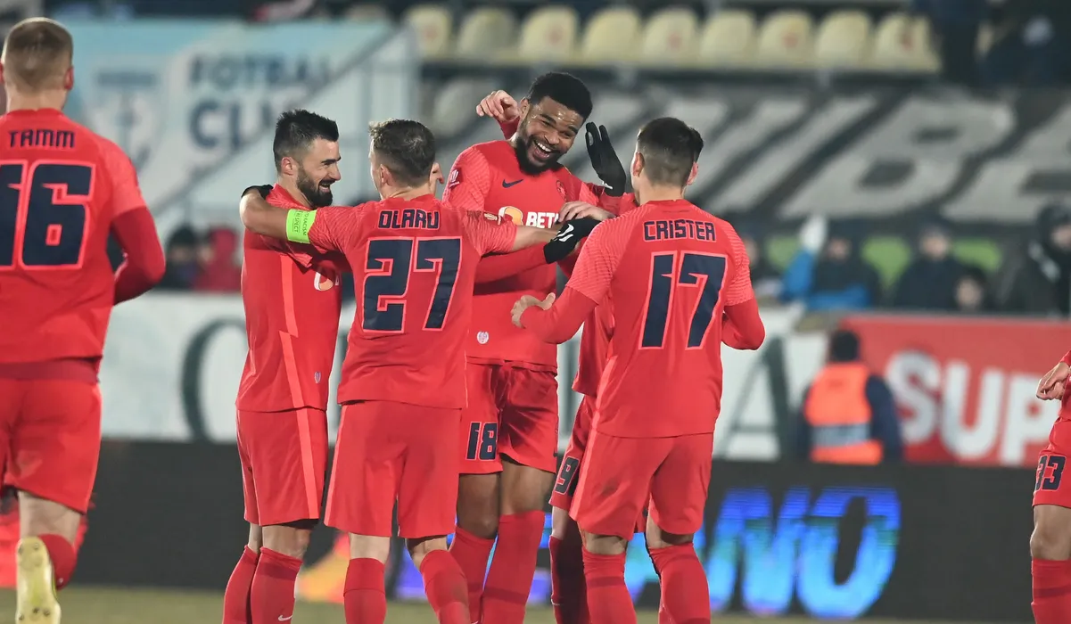 Bucurie a fotbalistilor stelisti dupa un gol marcat cu Valentin Cretu, Sylas Laouari Edjouma Malcom si Iulian Lucian Cristea la meciul de fotbal dintre FC Voluntari si FCSB, contand pentru Superliga Superbet, desfasurat pe Stadionul Anghel Iordanescu din Voluntari, duminica 12 februarie 2023. © FOTO:Razvan Pasarica/SPORT PICTURES
