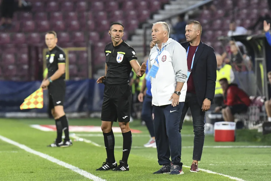 Dan Vasile Petrescu, Cristian Călin Panin și Arbitrul de rezerva Florin Ovidiu Mazilu în meciul de fotbal dintre FC CFR 1907 Cluj si UTA Arad, contând pentru Superliga Superbet, desfășurat pe Stadionul Dr.Constantin Rădulescu din Cluj-Napoca, sâmbătă 28 septembrie 2024. © FOTO: Flaviu BUBOI/SPORT PICTURES