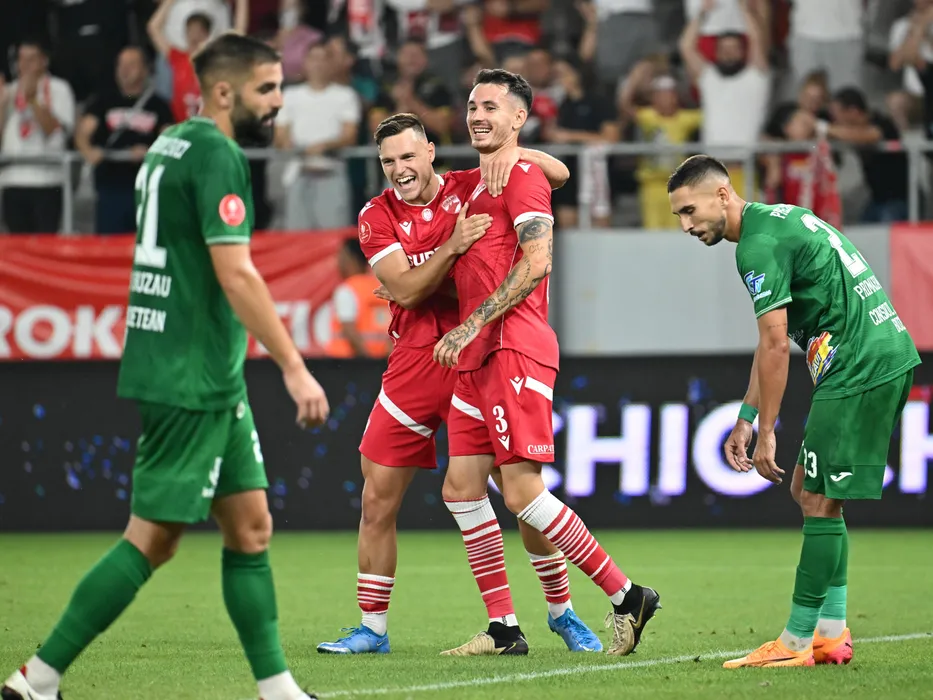 Fotbaliștii dinamoviști Dennis Dorin Politic si Raul Marian Oprut se bucură dupa un gol marcat in meciul de fotbal dintre Dinamo Bucuresti si Gloria Buzau, din cadrul Superligii Superbet, desfasurat pe Stadionul National Arcul de Triumf din Bucuresti, vineri 2 august 2024. © FOTO:Razvan Pasarica/SPORT PICTURES