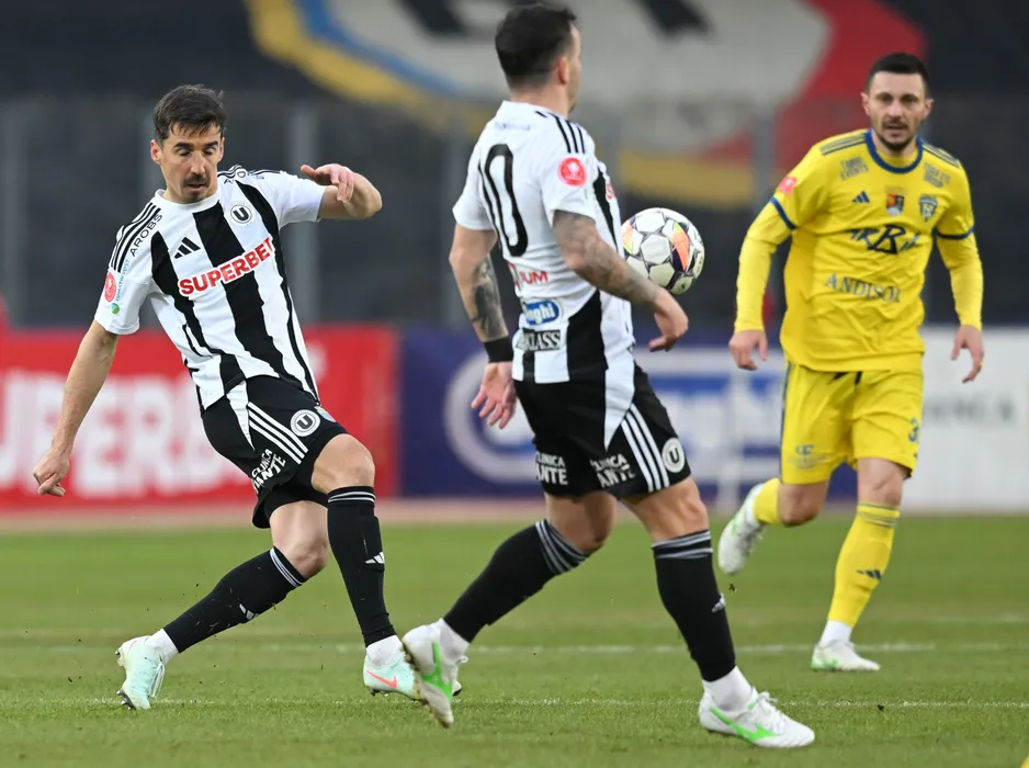 Andrei Viorel Artean, Dan Nicolae Nistor si Florin Flavius Purece in meciul de fotbal dintre FC Universitatea Cluj si AFC Unirea 04 Slobozia, contand pentru Superliga Superbet, desfasurat pe Stadionul Cluj Arena din Cluj-Napoca, luni 17 februarie 2025. © FOTO: Flaviu Buboi/SPORT PICTURES