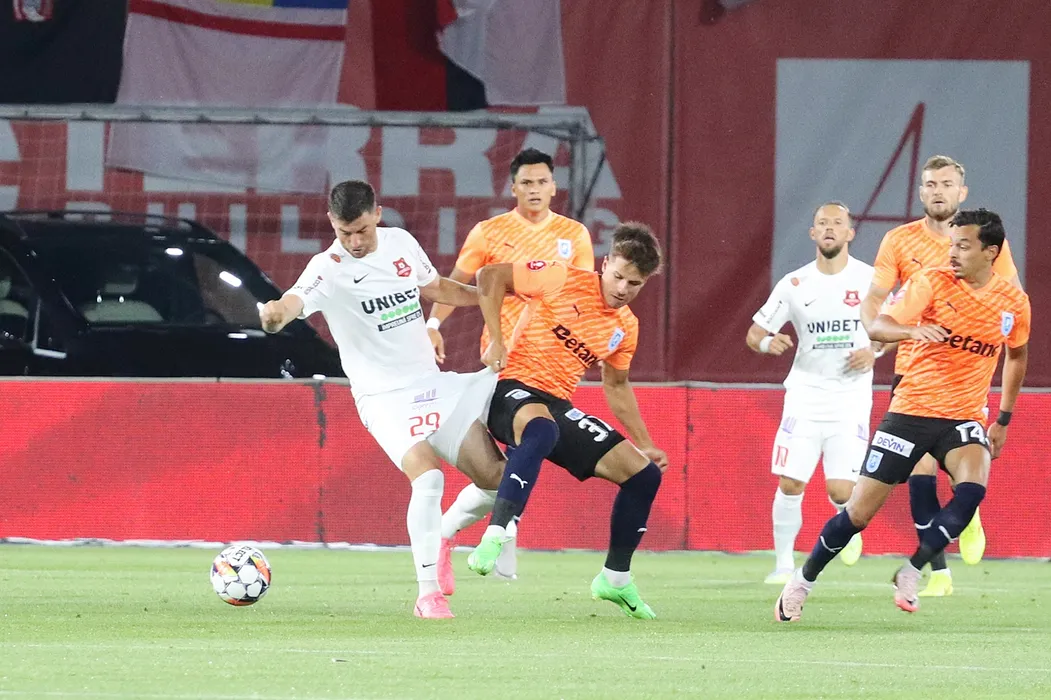 Ciprian Ionuț Biceanu și Marian Danciu, Lyes Hafid Houri în meciul de fotbal dintre AFC Hermannstadt Sibiu si Universitatea Craiova, contând pentru Superliga Superbet, desfășurat pe Stadionul Municipal din Sibiu, vineri 12 iulie 2024. © FOTO: Valentin MACREA/SPORT PICTURES