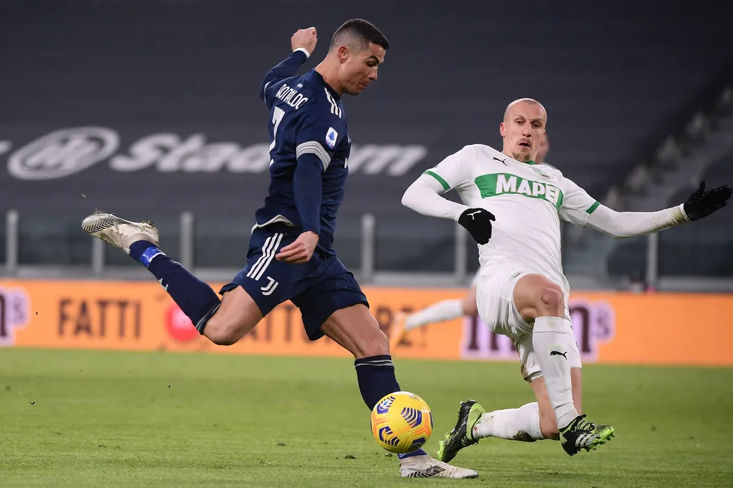 Cristiano Ronaldo of Juventus FC and Vlad Chiriches of US Sassuolo compete for the ball during the Serie A football match between Juventus FC and US Sassuolo Calcio at Allianz stadium in Torino (Italy), January 10th, 2021. Photo Federico Tardito / Insidefoto/Sipa USA,Image: 582397780, License: Rights-managed, Restrictions: *** World Rights Except Germany, Italy, Japan, and The Netherlands ***, Model Release: no