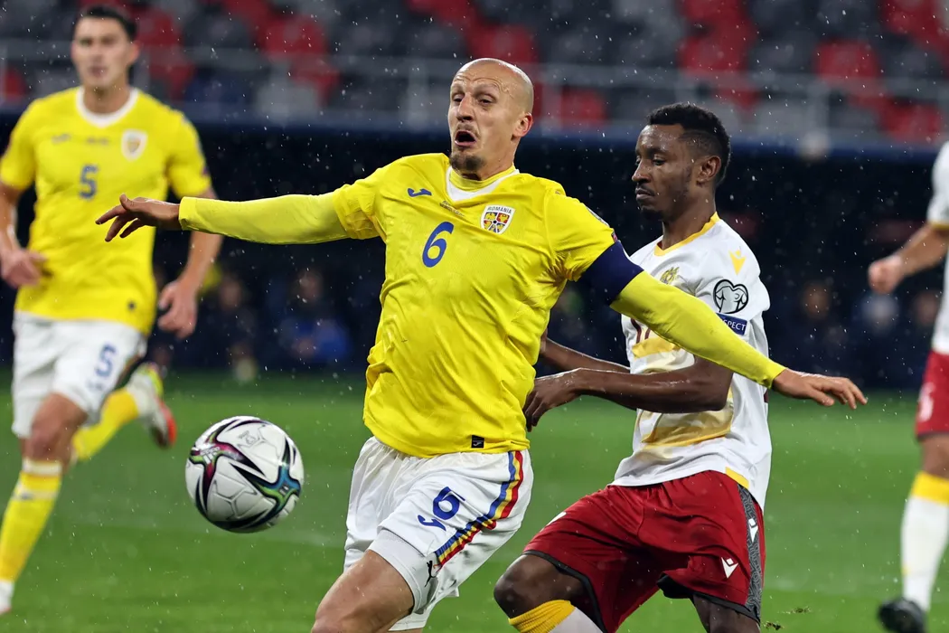Vlad Chiriches (C), de la nationala Romaniei, lupta pentru balon in timpul meciului de fotbal contra echipei Armenia, din preliminariile CM 2022, disputat pe stadionul Steaua din Bucuresti, luni, 11 octombrie 2021. GEORGE FILIP / MEDIAFAX FOTO