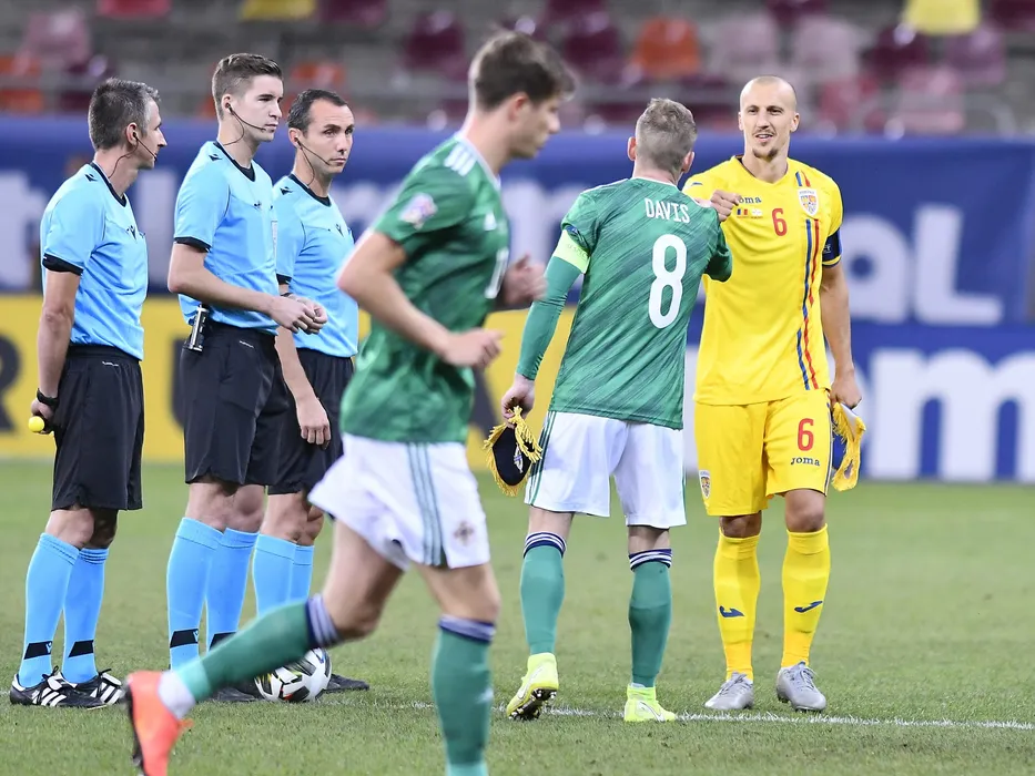 Brigada de arbitrii formata din Cyril Mugnier, Francois Letexier si Nicolas Danos alaturi de capitanii Steven Davis si Vlad Chiriches in meciul de fotbal dintre Romania si Irlanda de Nord, contand pentru Liga Natiunilor, desfasurat fara spectatori pe Arena Nationala din Bucuresti, vineri 4 septembrie 2020. © FOTO:Razvan Pasarica/SPORT PICTURES