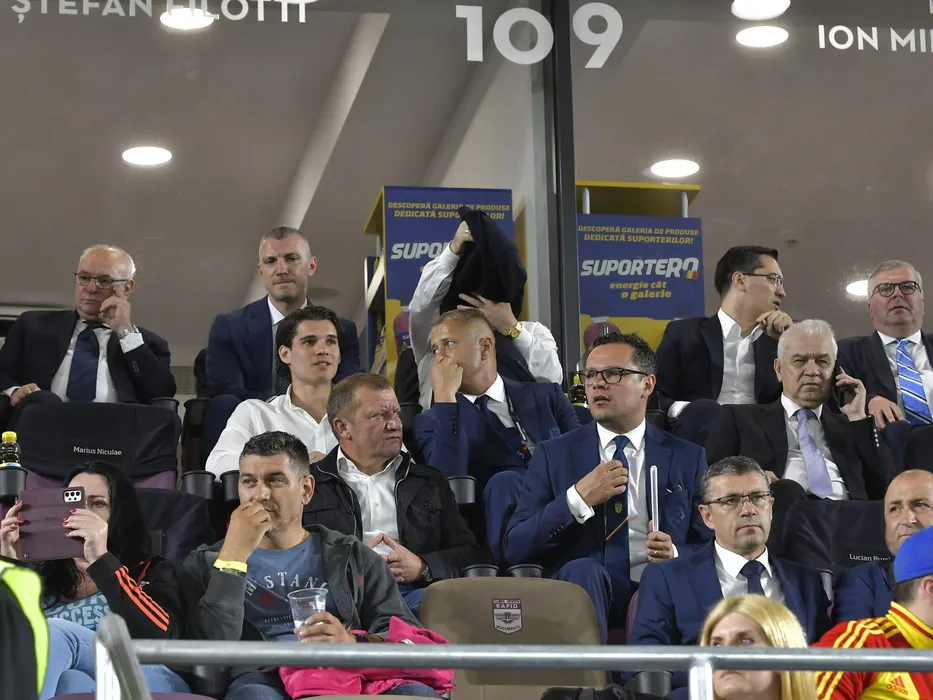 Octavian Goga, Ianis Hagi, Dorinel Munteanu, Vlad Munteanu, Gabriel Bodescu, Razvan Burleanu si Anghel Iordanescu in tribuna la meciul de fotbal dintre Romania si Finlanda, contand pentru Liga Natiunilor, desfasurat pe Stadionul Rapid Giulesti din Bucuresti, sambata 11 iunie 2022. © FOTO:Razvan Pasarica/SPORT PICTURES