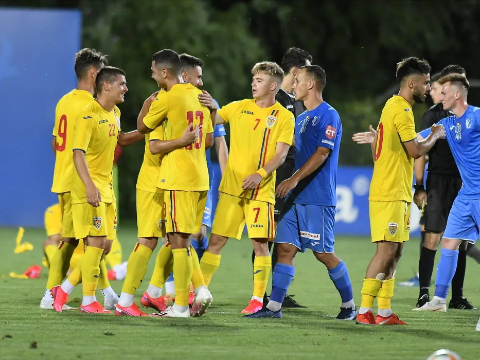 Fotbalistii romani Alexandru Voda, Vladimir Screciu, Andrei Ciobanu si Claudiu Petrila se saluta dupa meciul amical de fotbal dintre Romania U21 si Farul Constanta, desfasurat fara spectatori pe terenul central al Centrului National de Fotbal de la Mogosoaia, joi 6 august 2020. © FOTO:Razvan Pasarica/SPORT PICTURES