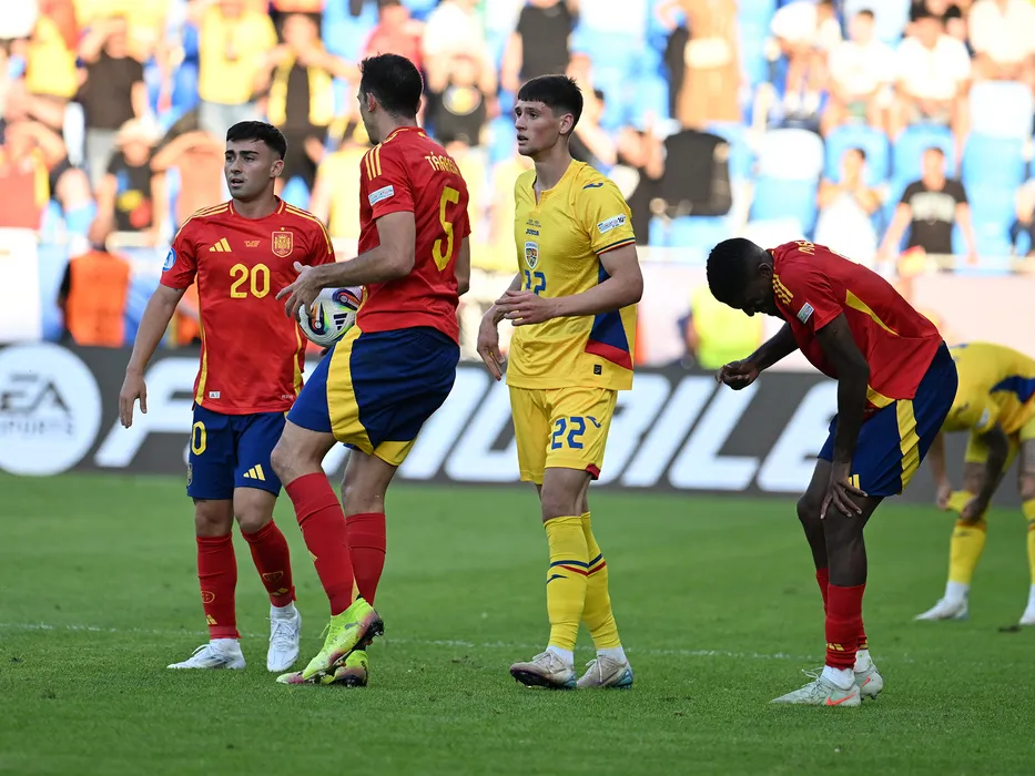 Alberto Moleiro si Vladislav Blanuta in meciul de fotbal dintre Spania U21 si Romania U21, din cadrul UEFA EURO U21 din Slovacia, desfasurat pe Stadionul National de fotbal din Bratislava, sambata 14 iunie 2025. © FOTO:Razvan Pasarica/SPORT PICTURES