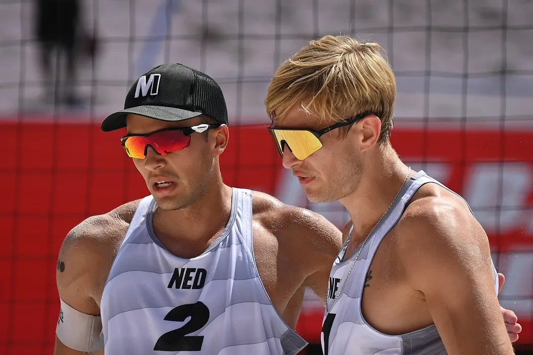 Turnaj Pro Tour kategorie Elite v plážovém volejbalu, 8. června 2024, Dolní oblast Vítkovice, Ostrava. Jakub Šépka, Jiří Sedlák z Česka a Steven van de Velde (vpravo), Matthew Immers (vlevo) z Nizozemska.,Image: 879920825, License: Rights-managed, Restrictions: , Model Release: no