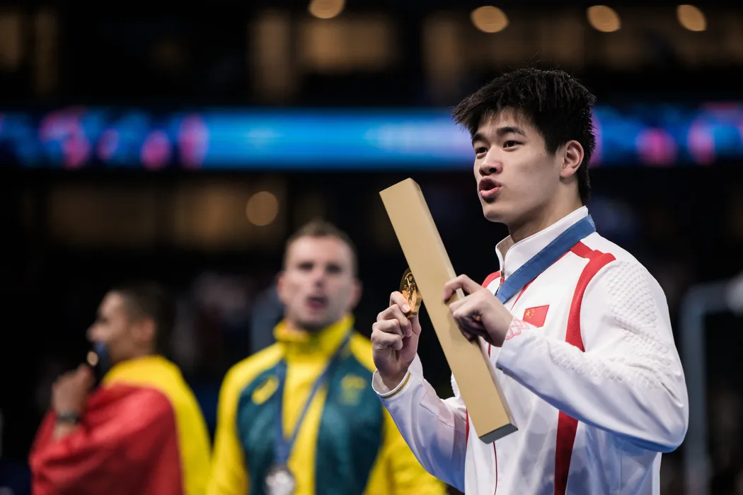 July 31, 2024, Paris, FRANCE: 240731 Pan Zhanle of China celebrates with his gold medal after the men’s 100 meters freestyle swimming final during day 5 of the Paris 2024 Olympic Games on July 31, 2024 in Paris..Photo: Maxim Thoré / BILDBYRÃ…N / kod MT / MT0632.simning swimming svømming olympic games olympics os ol olympiska spel olympiske leker paris 2024 paris-os paris-ol 5 bbeng jubel (Credit Image: © Maxim Thore/Bildbyran via ZUMA Press)