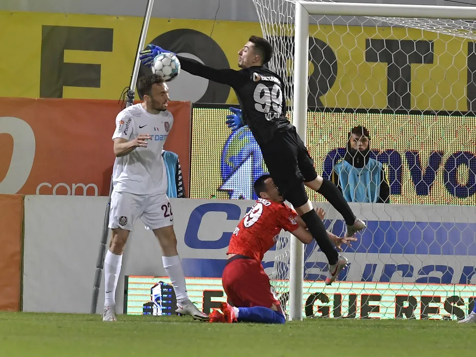 Gabriel Debeljuh, Adrian Gheorghe Sut si Andrei Daniel Vlad in meciul de fotbal dintre FCSB si CFR Cluj, contand pentru Play-off-ul Ligii 1 Casa Pariurilor, desfasurat fara spectatori pe Stadionul Marin Anastasovici din Giurgiu, luni 3 mai 2021. © FOTO:Razvan Pasarica/SPORT PICTURES