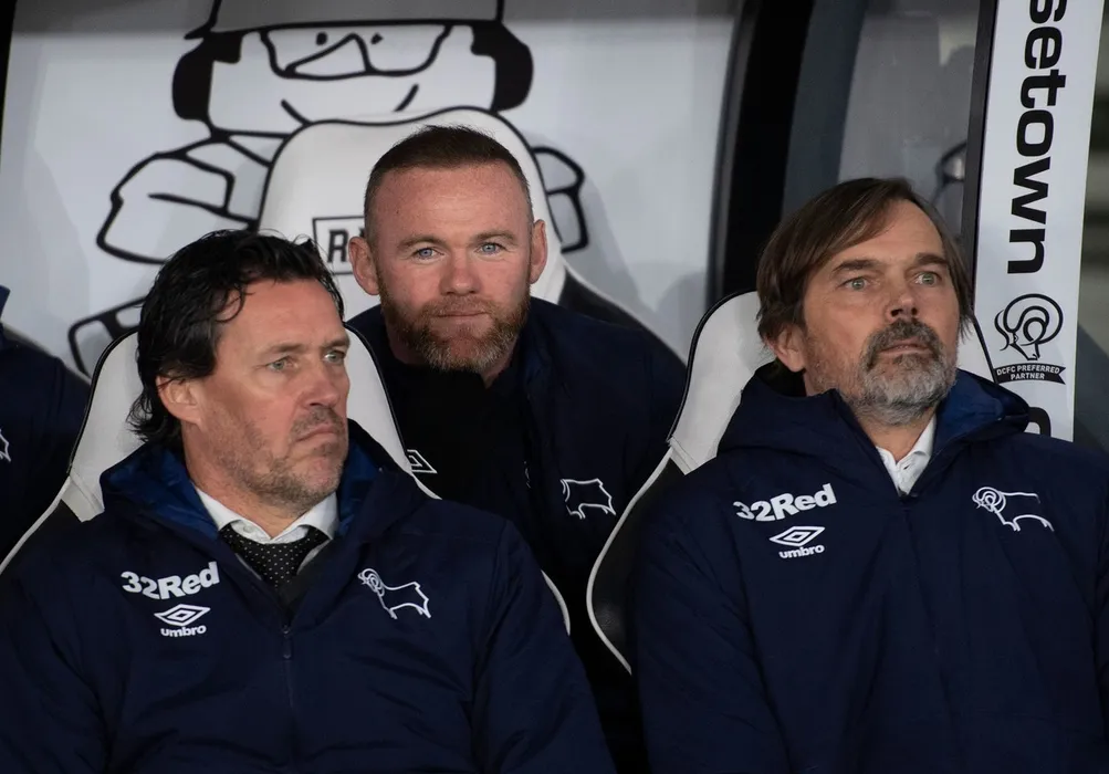 Derby County player coach Wayne Rooney sits with assistant manager Chris Van Der Weerden and manager Phillip Cocu Derby County v Charlton Athletic, EFL Sky Bet Championship, Football, Pride Park, Derby, UK - 30 Dec 2019, Image: 490369586, License: Rights-managed, Restrictions: EDITORIAL USE ONLY No use with unauthorised audio, video, data, fixture lists, club/league logos or "live" services. Online in-match use limited to 120 images, no video emulation. No use in betting, games or single club/league/player publications., Model Release: no, Credit line: Anna Gowthorpe/BPI / Shutterstock Editorial / Profimedia