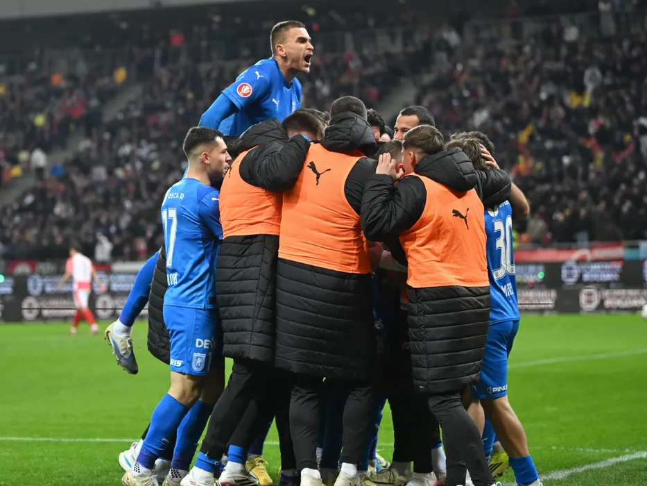 Fotbalistii craioveni Carlos Andrei Mora Montoya, Oleksandr Romanchuk si Assad Al Islam Al Hamlawi se bucura dupa un gol marcat in meciul de fotbal dintre Dinamo Bucuresti si Universitatea Craiova, din cadrul Play off-ului Superligii Superbet, desfasurat pe Arena Nationala din Bucuresti, joi 19 martie 2026. © FOTO:Razvan Pasarica/SPORT PICTURES