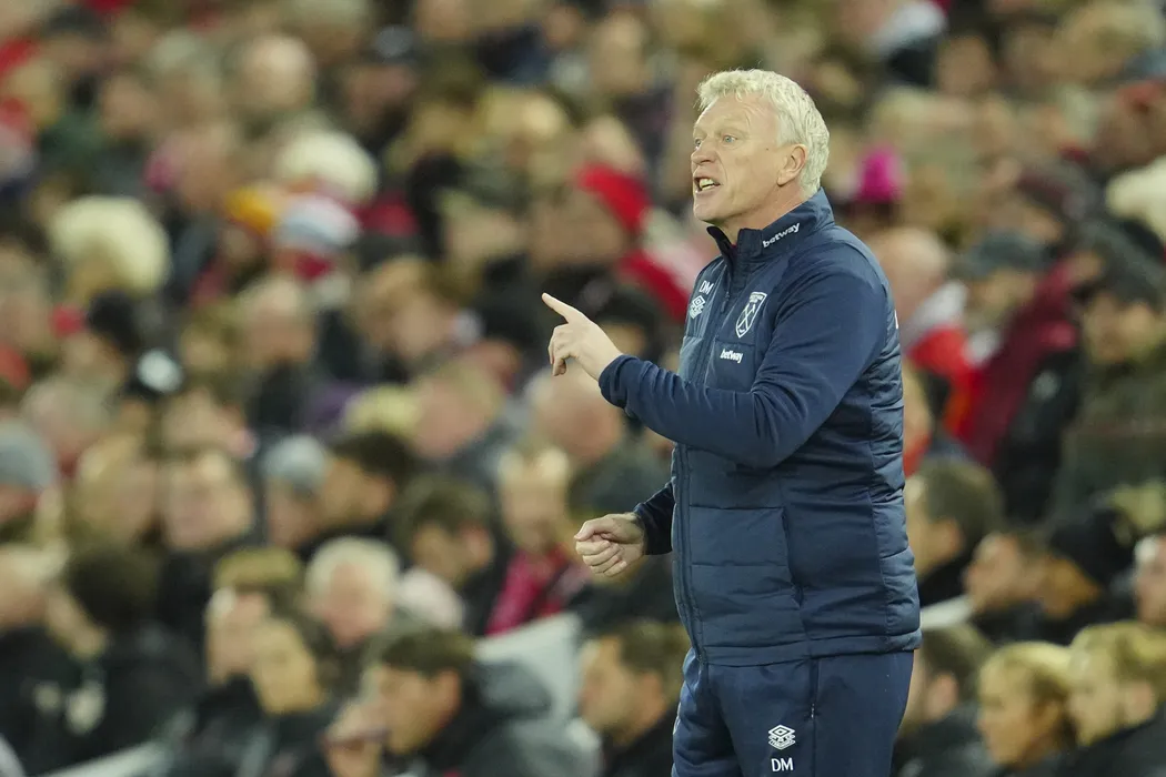 West Ham's manager David Moyes gestures during the English Premier League soccer match between Liverpool and West Ham United at Anfield stadium in Liverpool, England, Wednesday, Oct. 19, 2022. (AP Photo/Jon Super)