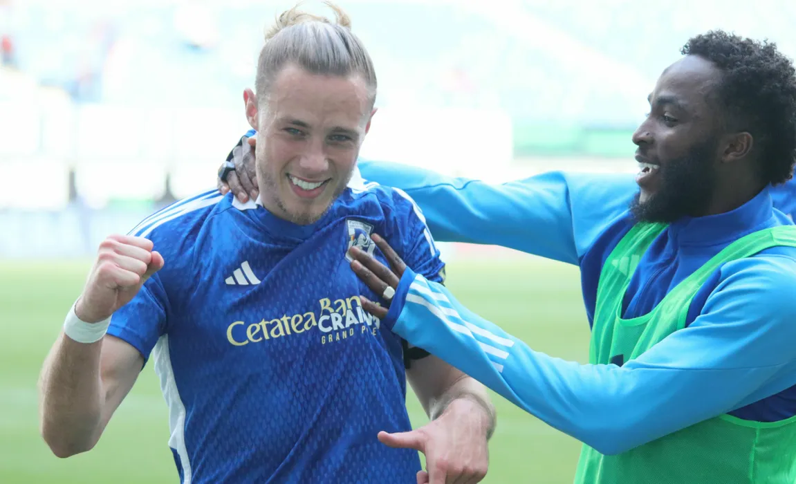 William Guido R Baeten felicitat de Sekou Sidibe după un gol marcat în meciul de fotbal dintre FCU 1948 Craiova și FC Universitatea Cluj, contând pentru Superliga Superbet Play-Out, desfășurat pe Stadionul Ion Oblemenco din Craiova, sâmbătă 27 aprilie 2024. © FOTO: Cătălin CIUPUREANU/SPORT PICTURES