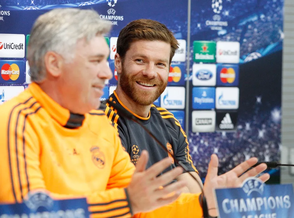 Carlo Ancelotti and Xabi Alonso during the training session prior the UEFA Champions League soccer match between Bayer of Munich and Real Madrid in Madrid, Tuesday 22, April , 2014.,Image: 191615360, License: Rights-managed, Restrictions: , Model Release: no