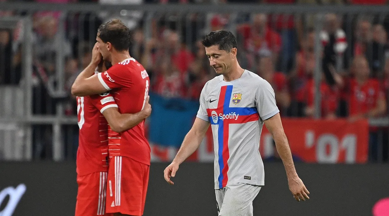 Robert LEWANDOWSKI FC Barcelona, Barca , Enttaeuschung,Frust,enttaeuscht, frustriert,niedergeschlagen, geht nach Spielende vom Platz,Aktion. hinten jubelt Leon GORETZKA Bayern Muenchen mit Leroy SANE Bayern Muenchen. Fussball Champions League / FC Bayern Muenchen -FC Barcelona 2-0, Gruppenphase, 2.Spieltag am 13.09.2022, A L L I A N Z A R E N A. *** Robert LEWANDOWSKI FC Barcelona , disappointment,frustration,frustrated,dejected,walks off the pitch at the end of the game,action behind cheers Leon GORETZKA Bayern Muenchen with Leroy SANE Bayern Muenchen Football Champions League FC Bayern Muenchen FC Barcelona 2 0, group stage, 2 match day on 13 09 2022, A L L I A N Z A R E N A