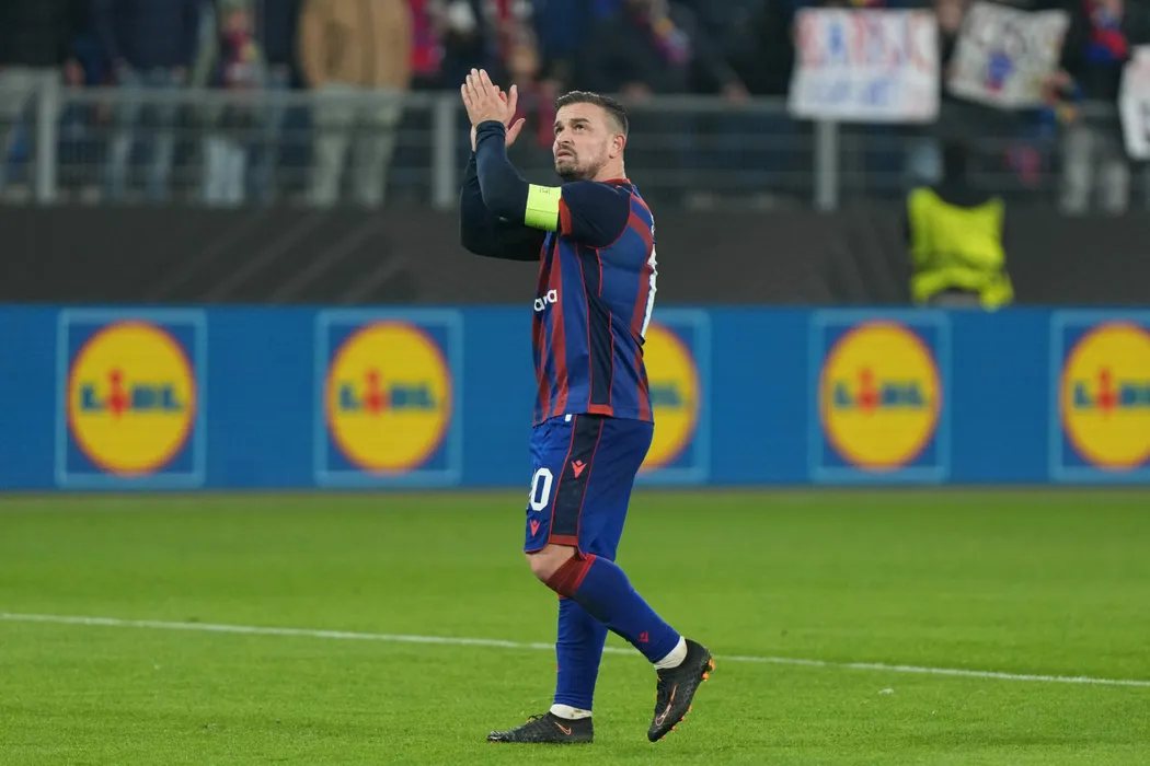 Florin Lucian Tanase saluta suporteriil dupa meciul de fotbal dintre FC Basel si FCSB, contand pentru UEFA Europa League, desfasurat pe Stadionul St. Jakob-Park din Basel, joi 6 noiembrie 2025. © FOTO:Marius Tudor/SPORT PICTURES