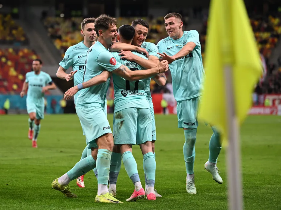 Bucurie a fotbalistilor clujeni Louis Munteanu, Matei Christian Ilie, Lindon Emerllahu si Alin Răzvan Fica dupa un gol marcat de catre Meriton Korenica in meciul de fotbal dintre Dinamo Bucuresti si CFR Cluj, contand pentru Play off-ul Superligii Superbet, desfasurat pe Arena Nationala din Bucuresti, luni 28 aprilie 2025. © FOTO:Razvan Pasarica/SPORT PICTURES