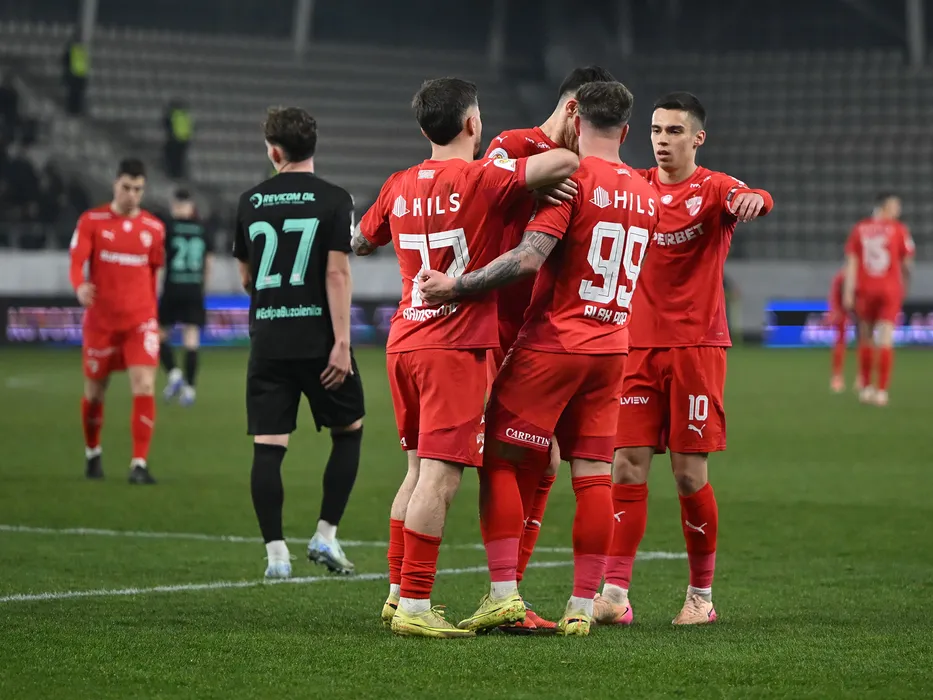 Bucurie a fotbalistilor dinamovisti printre care Catalin Ionut Cirjan dupa un gol marcat in meciul de fotbal dintre Dinamo Bucuresti si Metalul Buzau, contand pentru Cupa Romaniei Betano, desfasurat pe Stadionul Arcul de Triumf din Bucuresti, joi 5 martie 2026. © FOTO:Razvan Pasarica/SPORT PICTURES