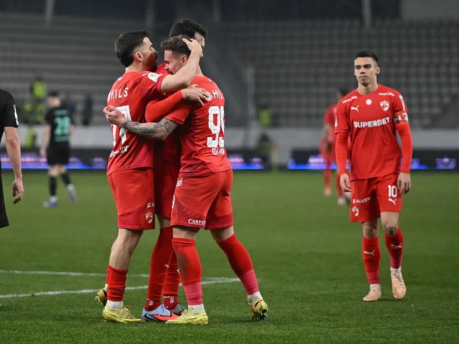 Bucurie a fotbalistilor dinamovisti Danniel Charles Armstrong si Alexandru Mihai Constantin Pop dupa un gol marcat in meciul de fotbal dintre Dinamo Bucuresti si Metalul Buzau, contand pentru Cupa Romaniei Betano, desfasurat pe Stadionul Arcul de Triumf din Bucuresti, joi 5 martie 2026. © FOTO:Razvan Pasarica/SPORT PICTURES