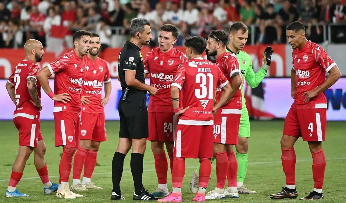 Arbitrul central Horatiu Mircea Fesnic discuta cu fotbalistii dinamovisti Gabriel Rodrigues De Mourad10/, Deniz Giafer, Nelut Stelian Rosu, Adnan Golubovic si Quentin Alexandre Julien Bena in meciul de fotbal dintre Dinamo Bucuresti si Universitatea Craiova, din cadrul Superligii Superbet, desfasurat pe Stadionul National Arcul de Triumf din Bucuresti, luni 17 iulie 2023. © FOTO:Razvan Pasarica/SPORT PICTURES