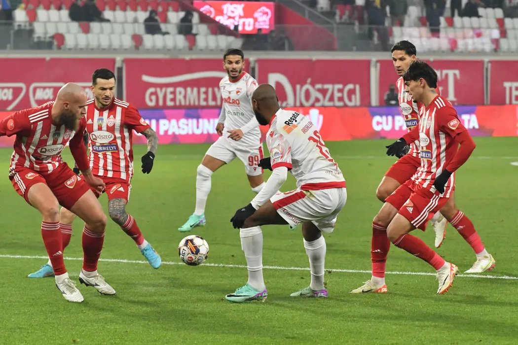 Cosmin Gabriel Matei, Branislav Ninaj, Bogdan Florin Oteliță și Hakim Djamel Abdallah în meciul de fotbal dintre FC Sepsi OSK Sfantu Gheorghe și SC Dinamo 1948 Bucuresti, contând pentru SuperLiga Superbet, desfășurat pe Stadionul SEPSI Arena OSK din Sfântu Gheorghe, luni 4 decembrie 2023. © FOTO: Bogdan BALAS/SPORT PICTURES