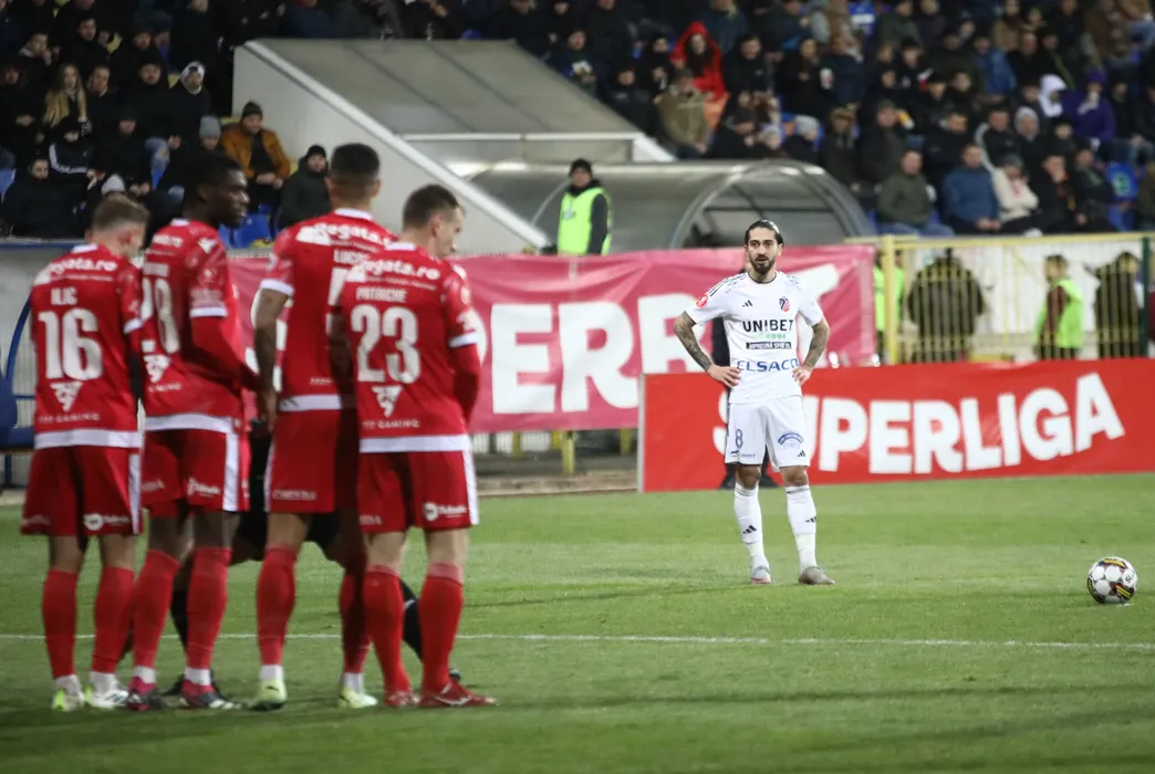 Eduard Marian Florescu se pregătește să execute o lovitură liberă în meciul de fotbal dintre AFC Botosani și SC Dinamo 1948 SA, contând pentru SUPERLIGA SUPERBET, desfășurat pe Stadionul Municipal din Botoșani, luni 18 decembrie 2023. © FOTO: Ionuț TABULTOC/SPORT PICTURES