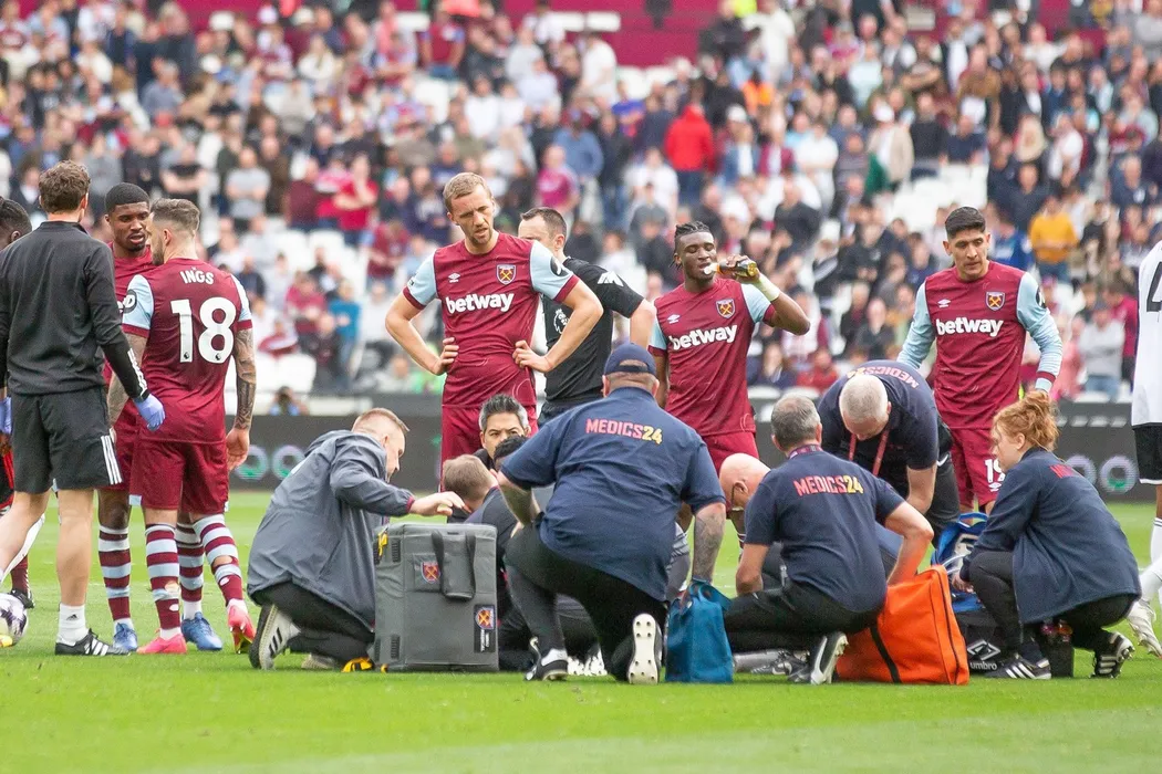Worried looking West Ham United players as George Earthy of West Ham United recives treatment on the pitch