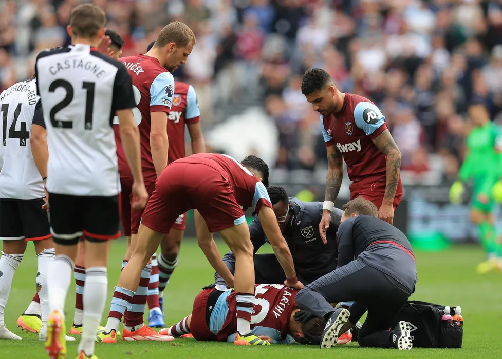 April 14, 2024, London: London, England, 14th April 2024. George Earthy of West Ham United lays on the floor after a collision with Nayef Aguerd of West Ham United (not pictured) during the Premier League match at the London Stadium, London.,Image: 864763730, License: Rights-managed, Restrictions: * United Kingdom Rights OUT *, Model Release: no