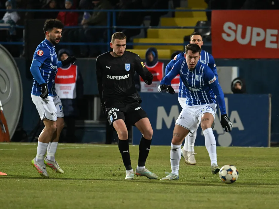 Narek Grigoryan, Oleksandr Romanchuk si Mihai Alexandru Isfan in meciul de fotbal dintre Farul Constanta si Universitatea Craiova, contand pentru Superliga Superbet, desfasurat pe Stadionul central al Academiei Gheorghe Hagi din Ovidiu, duminica 1 februarie 2026. © FOTO:Razvan Pasarica/SPORT PICTURES