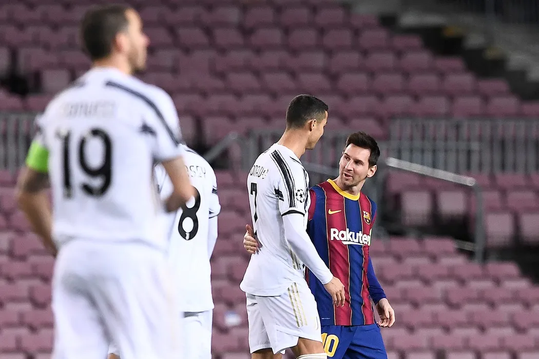 Juventus' Portuguese forward Cristiano Ronaldo greets Barcelona's Argentinian forward Lionel Messi (R) before the UEFA Champions League group G football match between Barcelona and Juventus at the Camp Nou stadium in Barcelona on December 8, 2020.,Image: 574551739, License: Rights-managed, Restrictions: , Model Release: no