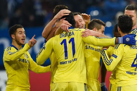 Drogba bucurându-se alături de colegii săi pentru golul din partida cu Schalke 04. FOTO: AFP