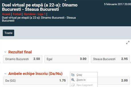 Concret, pentru etapa 22, Steaua are cota 2,50 la victoria cu Dinamo din Duelul Etapei, „câinii” au 2,95 pentru o victorie, iar egalul 3,00.
