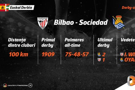 Pentru locuitorii Țării Bascilor, regiune cunoscută pentru dârzenia cu care nu renunță la tradiție, Bilbao – Real Sociedad e unul dintre cele mai așteptate momente ale anului. Genul de derby despre care se vorbește toată săptămâna de dinainte și multe zile după, înfruntarea care împarte în două Țara Bascilor se joacă pentru a 145-a oară, la 110 ani distanță de la prima întâlnire. Distanța dintre Bilbao și Sociedad este de doar 100 de kilometri, orgoliile sunt mari, iar gazdele de vineri seară au întâietate în rivalitate (75 de victorii, 48 de egaluri, 57 de înfrângeri). Ultimul derby s-a terminat în favoarea lui Real Sociedad, 2-1, iar Inaki Williams și Oyarzabal sunt așteptați să încânte pe San Mames.