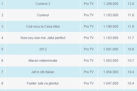 Este și cazul filmului Curierul 2, difuzat pe Pro TV în luna martie. Pelicula a fost urmărită în medie de aproape 1,3 milioane de telespectatori la nivel urban, fiind lider în topul filmelor. Al doilea film al lunii martie a fost tot o peliculă cu Jason Statham, prima parte a seriei Curierul, urmărit de aproape 1,2 milioane de telespectatori de la orașe, după cum anunță Pagina de Media.