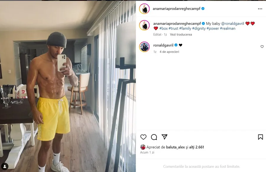 De curând Anamaria Prodan l-a fotografiat pe Ronald Gavril la bustul gol, pe pagina sa de Instagram, impresara lăsând un mesaj din doar doua cuvinte: „My baby”. Anamaria Prodan și-a obișnuit fanii cu postările alături de celebrul boxer, în ultima perioadă cei doi fiind nedespărțiți.