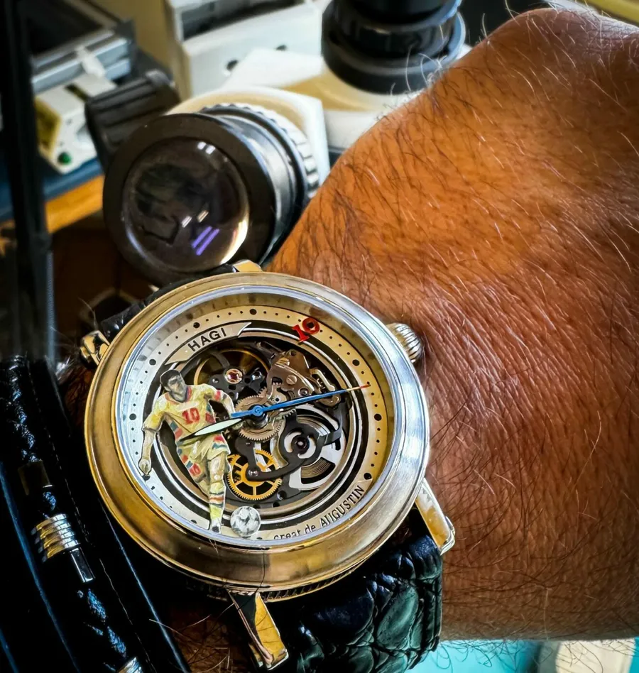 Concret, Augustin Matei a conceput un ceas unicat pentru Gheorghe Hagi, cu imaginea fostului mare fotbalist al României.