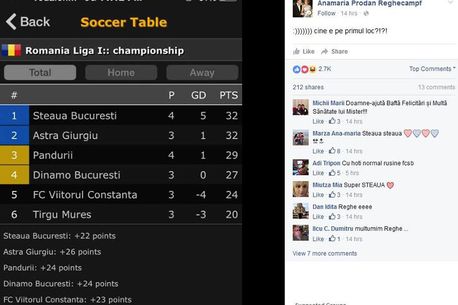 Soția lui Laurențiu Reghecampf a trăit intens jocull ce a dus-o pe Steaua pe prima poziție a clasamentului. La finalul partidei, aceasta a postat pe contul său de Facebook o captură cu clasamentul Ligii 1 și cu comentariul „Cine e pe primul loc?!”. Captura a fost făcută pe aplicația de mobil a site-ului livescore.com.