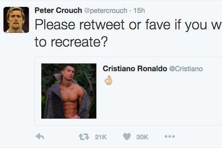 În „discuție” a intervenit și Peter Crouch, cu o postare care i-a cucerit pe utilizatorii Twitter. Perfect conștient că fizicul nu a fost niciodată punctul său forte și ironizat în trecut pentru asta, Crouch i-a întrebat pe internauți dacă și-ar dori să-l vadă în aceeași ipostază. „Redistribuiți sau dați like dacă vreți să recreez (imaginea n.r.)”, a întrebat atacantul de 2.01 m, iar reacția a fost pe măsură. Peste 60.000 de fani au răspuns și în scurt timp au apărut și imaginile editate în Photoshop.