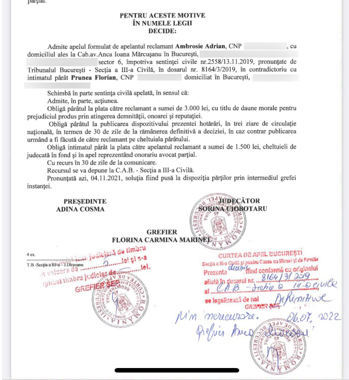 Florin Prunea a fost obligat, astfel, la plata a 3.000 de lei, sumă care reprezintă „daune morale pentru prejudiciul produs prin atingerea demnității, onoarei și reputației”.