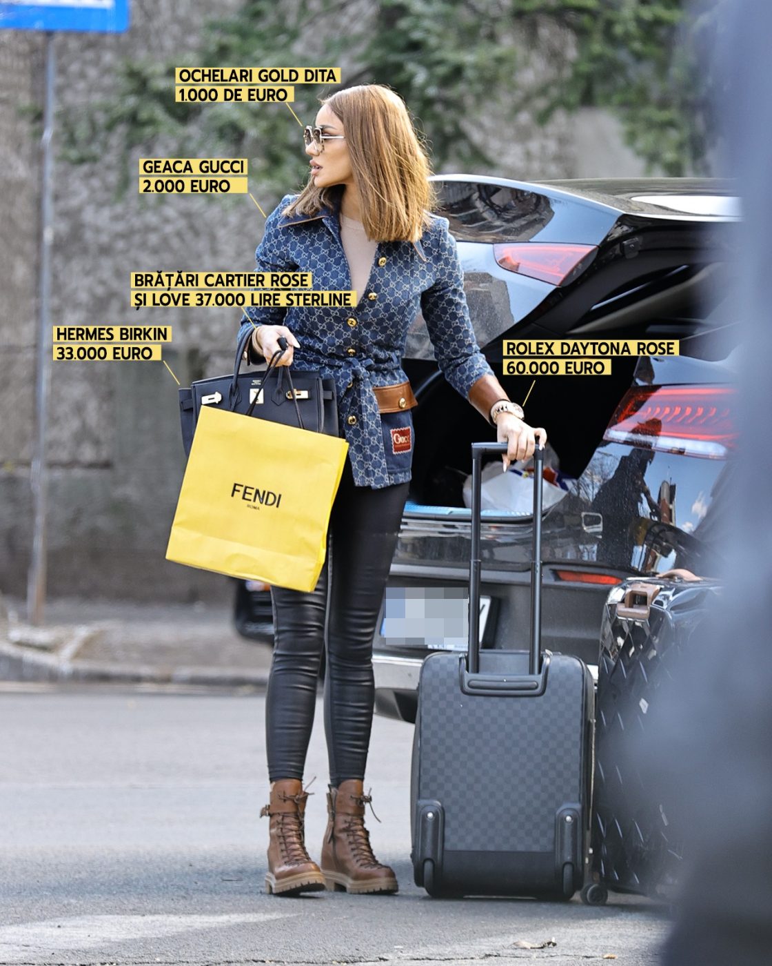 Clar, ceasul și brățările dau tonul! Outfit-ul a fost completat de geaca Gucci, de 2.000 de euro, și de poșeta Hermes Birkin, de 33.000 de euro, scrie Cancan.