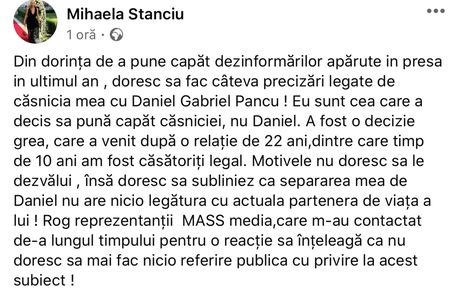 Imediat după ce a postat acest mesaj, Mihaela Stanciu, cea care a fost alături de Daniel Pancu timp de 22 de ani, și-a închis contul de Facebook.