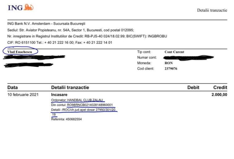 Nu pot să mă plâng, am încasat banii în termen record aș spune, dar surpriză, suma respectivă a fost virată din conturile Handbal Club Zalău, în niciun caz din contul reclamantului, după cum se poate vedea… Păi cum facem? Folosim banul public pentru interese personale?