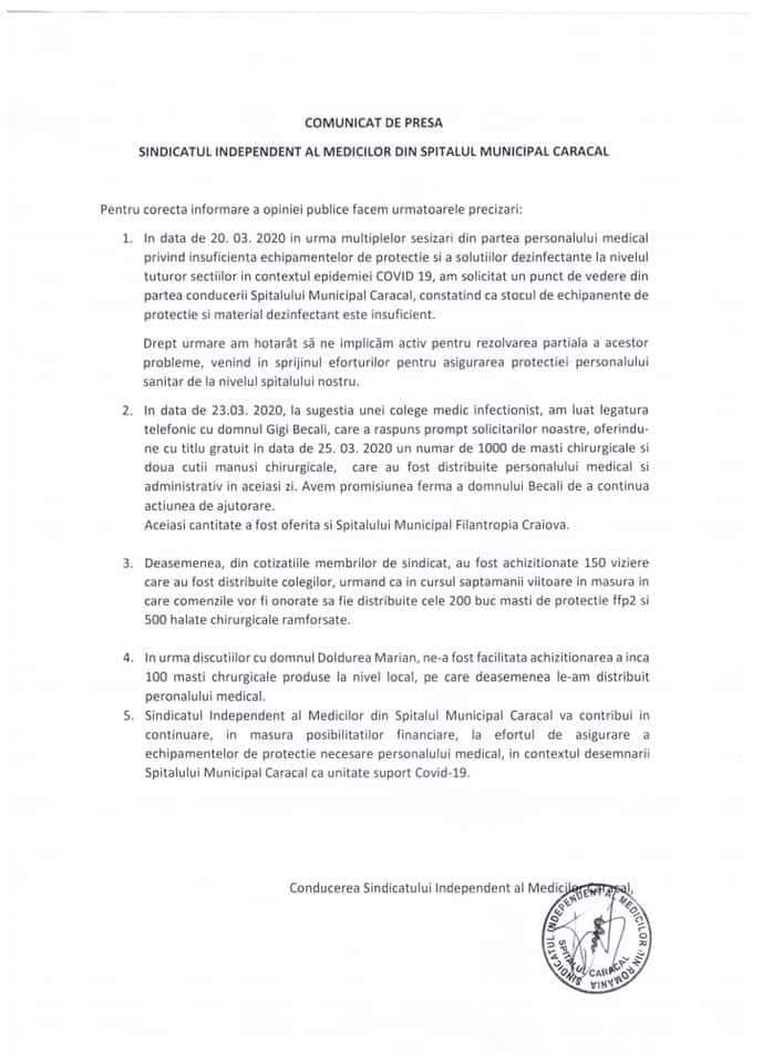 Sindicatul Independent al Medicilor din Spitalul Municipal Caracal va contribui, în continuare, în măsura posibilităților financiare, la efortul de asigurare a echipamentelor de protecție necesare personalului medical, în contextul desemnării Spitalului Municipal Caracal ca unitate de suport COVID – 19”.
