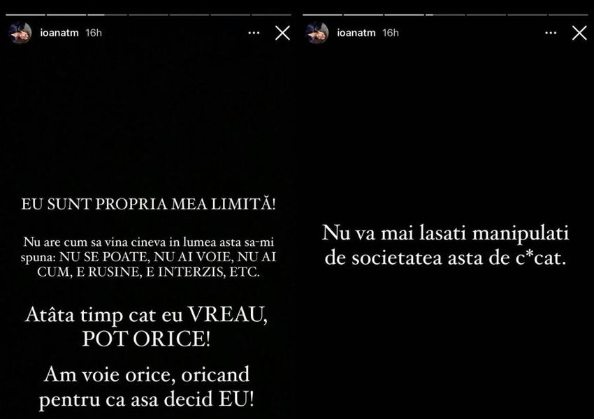„Eu sunt propria mea limită! Nu are cum să vină cineva în lumea asta să-mi spună: ”NU SE POATE, NU AI VOIE, NU AI CUM, E RUȘINE, E INTERZIS, ETC”. Atâta timp cât eu VREAU, POT ORICE! Am voie orice, oricând, pentru că așa decid EU! Nu vă mai lăsați manipulați de societatea asta de c*cat”, a scris Ioana pe contul personal de Instagram.