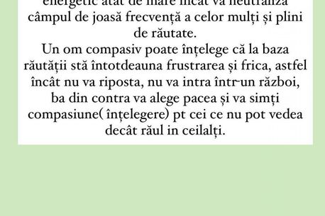„Iubirea unui singur om poate forma un câmp energetic atât de mare încât va neutraliza câmpul de joasă frecvență a celor mulți și plini de răutate. Un om compasiv poate înțelege că la baza răutății stă întotdeauna frustrarea și frica, astfel încât nu va risposta, nu va intra într-un război, ba din contră va alege pacea și va simți compasiune (înțelegere) pentru cei care nu pot vedea decât răul în ceilalți”, a scris Ioana Timofeciuc pe pagina sa de Instagram.